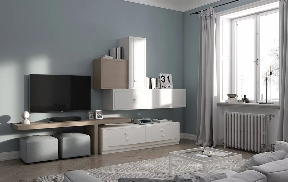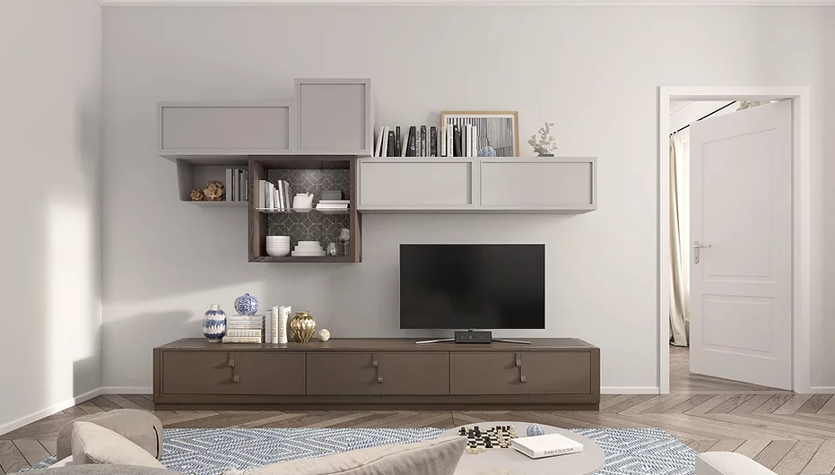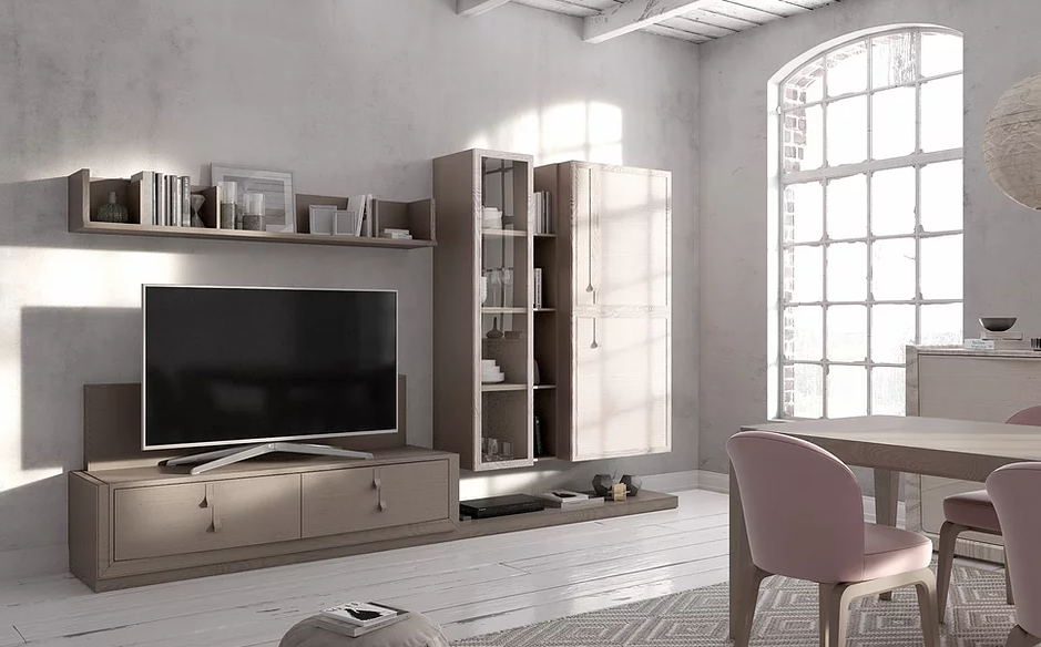 Frontali dei cassetti aggettanti impreziositi da piccole cascate di maniglie in legno massiccio. Finiture laccate e semi coprenti per un risultato sobrio, elegante ed originale.