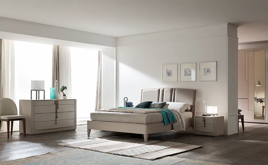 Nella camera, il luogo del riposo e del risveglio, queste  impressioni vengono riproposte nelle sottili geometrie degli arredi, ammorbidite da eleganti tonalità e impreziosite dal design della maniglia.