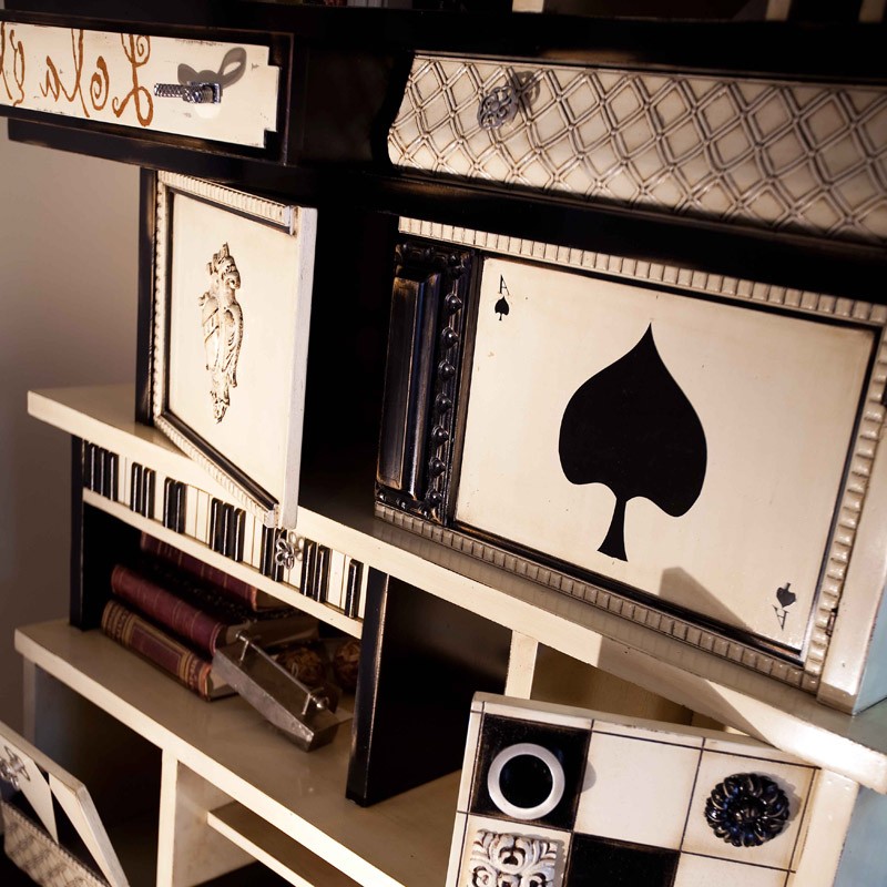 Proprio come in un gioco, questo pezzo ci fa sentire come se stessimo attraversando un labirinto, trovare cose nuove: una tastiera di pianoforte che si trasforma in un cassetto, pedine su una porta, diamanti e modanature che adornano le parti chiuse, la carta fortunata e lo scudo che nasconde la vera storia. Non è una libreria; è qualcosa di intrigante, enigmatico e bello .