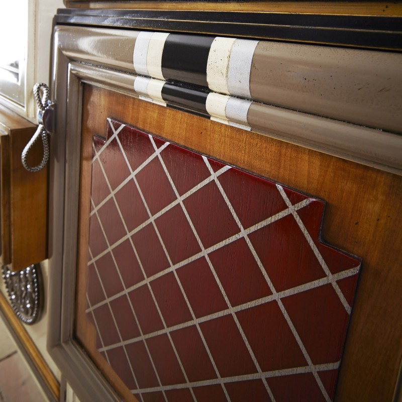 One è una credenza a muro. Dispone di 8 cassetti e sei ante, uno spazio di archiviazione perfetta. Inoltre, è molto solida, in quanto è realizzata in legno di tiglio e ciliegio.