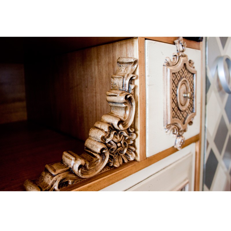 Una struttura moderna che incornicia un caos di forme, colori, modanature, texture e ferro battuto. Un pezzo audace, elegante e fantasioso, a metà tra moderno e classico.