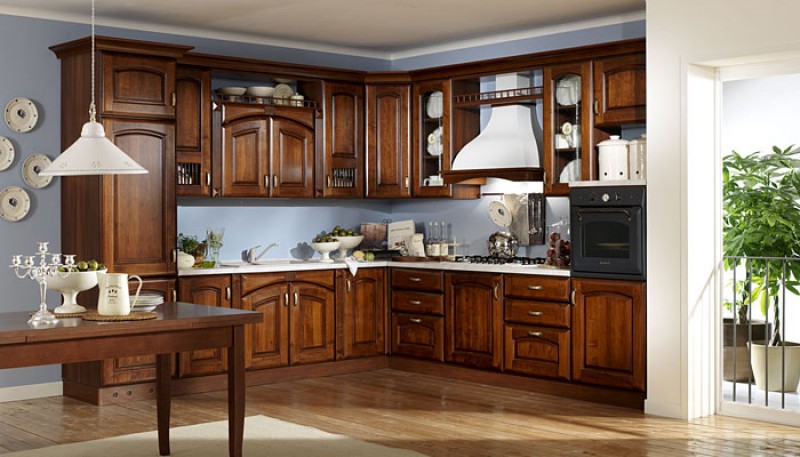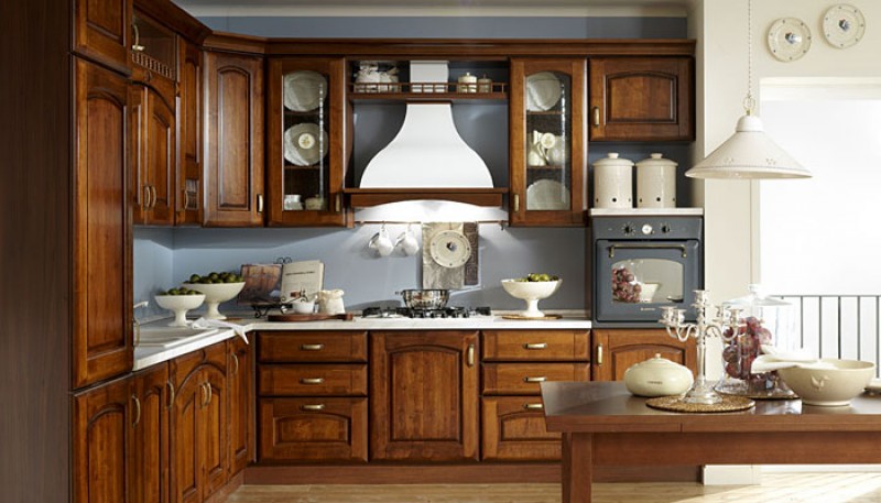 Anta sagomate in ontano con finitura noce anticato e colonnine intarsiate;