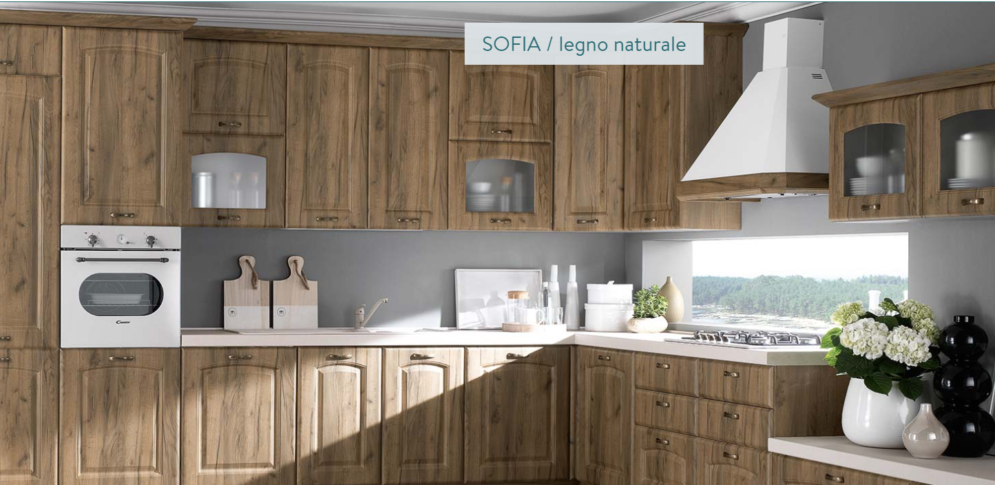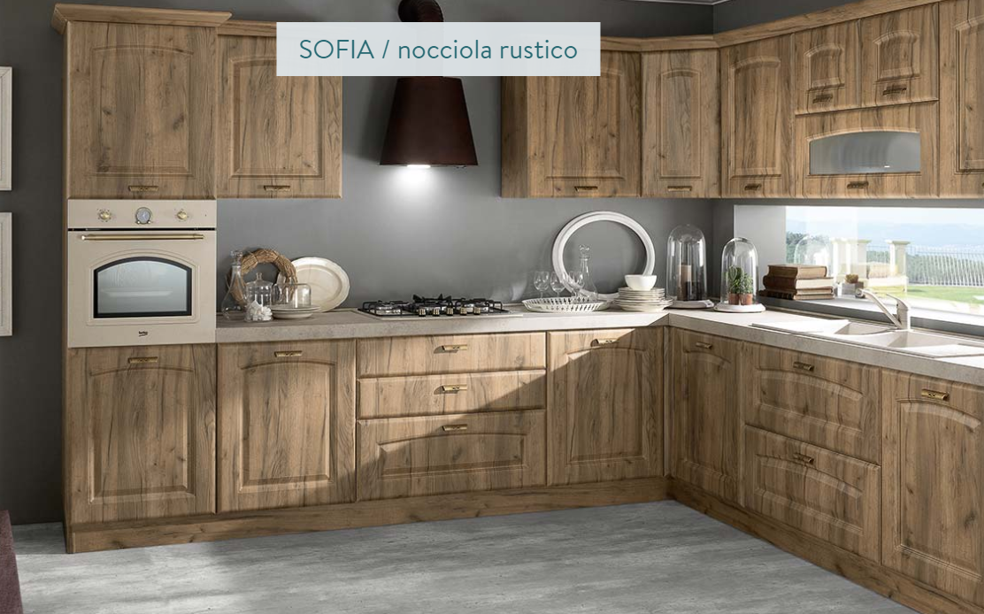 Anta classica con bugna a cappello di gendarme in MDF, spessore 22 mm., con rivestimento in PVC nei colori nocciola rustico e bianco rustico. Interno bianco. Vetrina con telaio in MDF e vetro satinato.