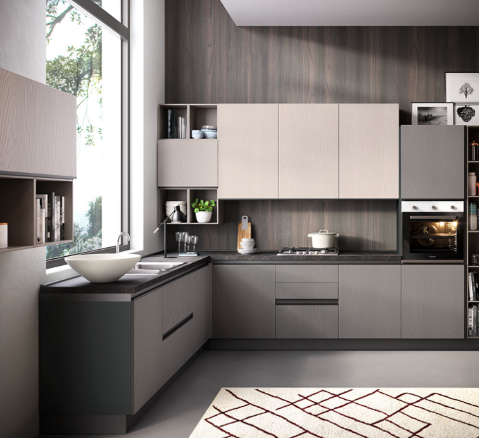 Zoe si impone col suo profilo elegante. Soluzioni di continuità con la maniglia integrata dellâanta in abbinamento alla gola nel colore lava. Colori sobri, ma dal carattere deciso con la finitura larice che richiama il legno con le sue venature e quella cemento dal fascino metropolitano. Zoe sperimenta configurazioni living innovative, allâinsegna di un mood dinamico e creativo.