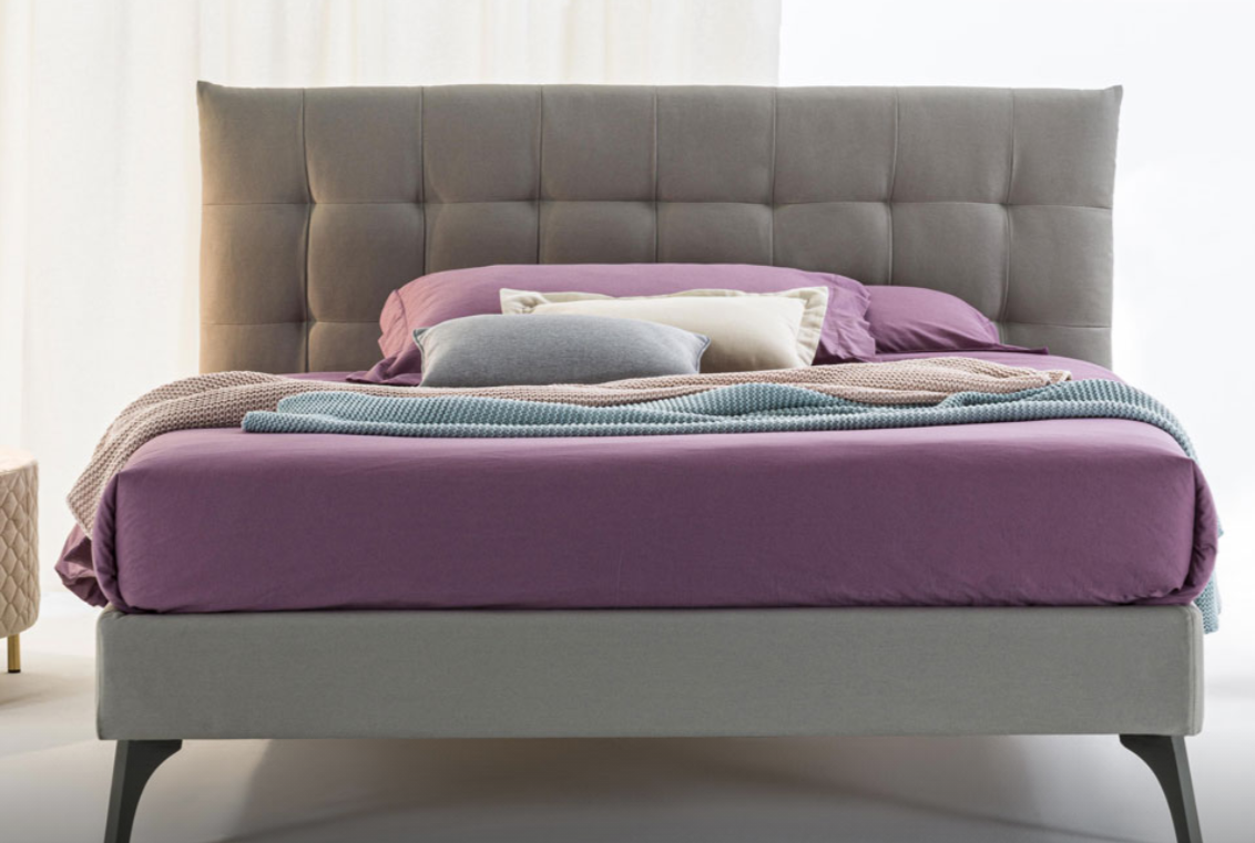 Letto tessile con testiera accuratamente trapuntata dalle moderne geometrie.