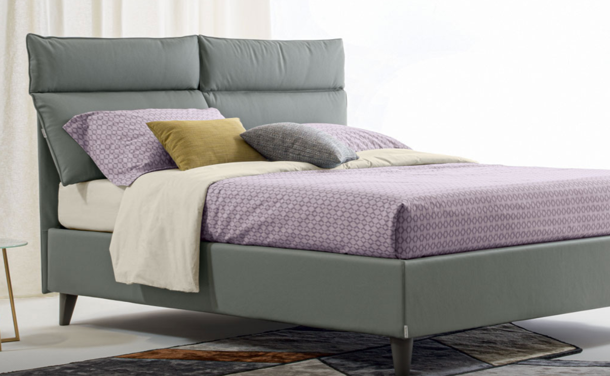 Letto tessile con morbida testiera imbottita dotata di cuscini reclinabili.