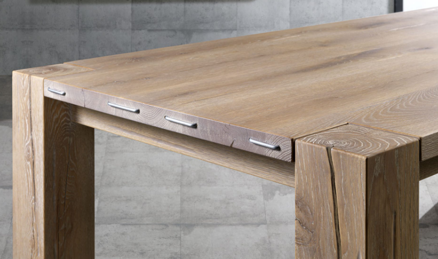 Tavolo massiccio con secche, sgorbiature e ferri di testa, ï¬sso. Nodi e crepe a vista non stuccati. Gamba quadrotto a vista 13,5x13,5 cm, H 77 cm. Disponibile in quercia con gamba a quadrotto. Olmo e noce canaletto solo con gamba lamellare.