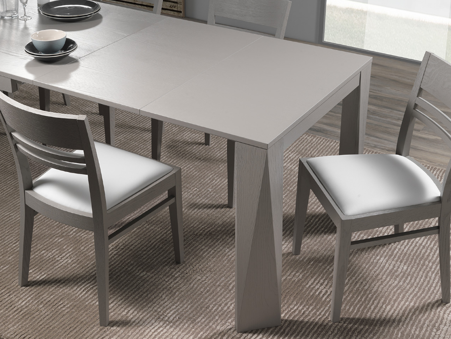 Tavolo impiallacciato su truciolare di pioppo, allungabile con sistema telescopico, con guide metalluche, e 2 prolunghe da 50 cm.
