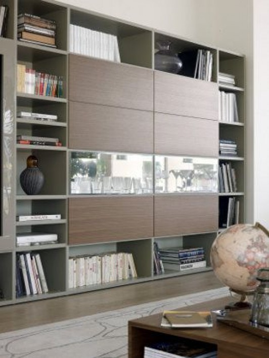 Realizzata per spalle ,cappello, basamento e ripiani sp.28 mm, schienale sp.14 mm, tutti in pannello di particelle di legno classe E1 impiallacciati wengè e noce canaletto o nobilitato con carte melaminiche per finitura laccato opaco, schienali anche in finitura lucido. Piani ponte sp.58mm in multistrato di legno.
