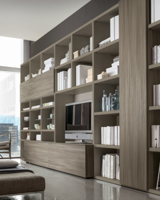 Tante combinazioni tra sfumature e materiali per questa libreria dove i vani a giorno di diverse grandezze si affiancano a moduli chiusi capienti e organizzati.