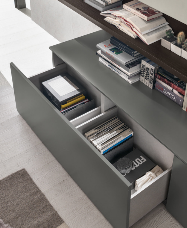 Moduli aperti, contenitori chiusi, mensola con schienale: un living con tanti elementi di design disponibile in diverse finiture e colori.