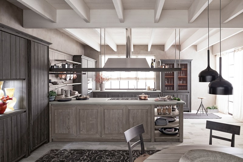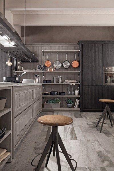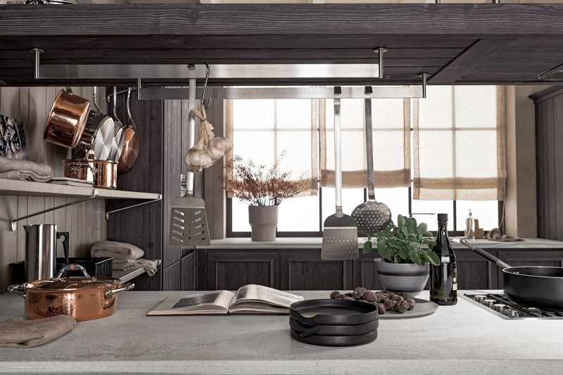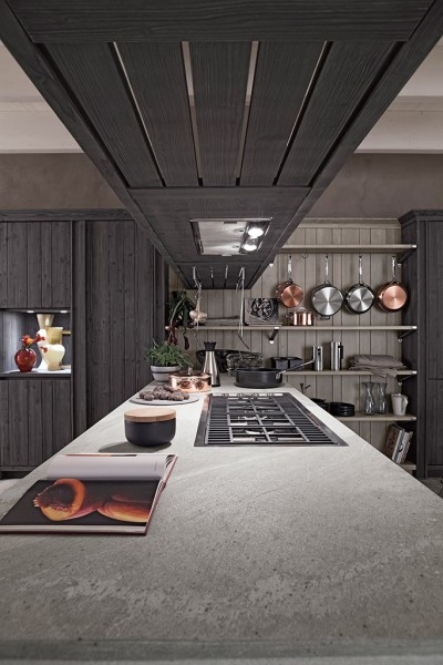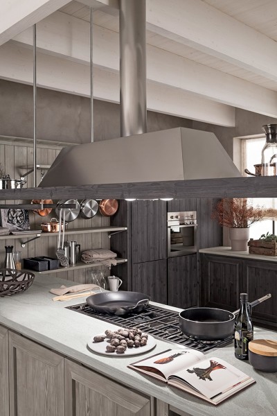 Questa versione della cucina Maestrale si basa su colori scuri: il grigio ardesia (più chiaro) della boiserie accostato alla tonalità più scura (grafite) di colonne e basi, rendono la cucina unica e di successo. Il top in pietra âquarziteâ in finitura sabbiata con inserito a filo pietra il piano cottura con griglie in ghisa, sono un tocco in più.