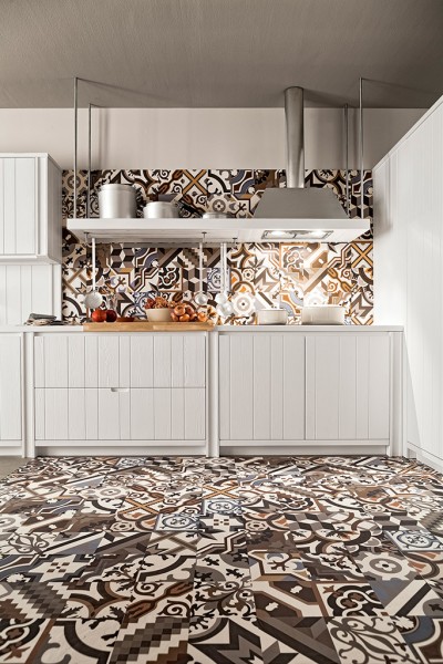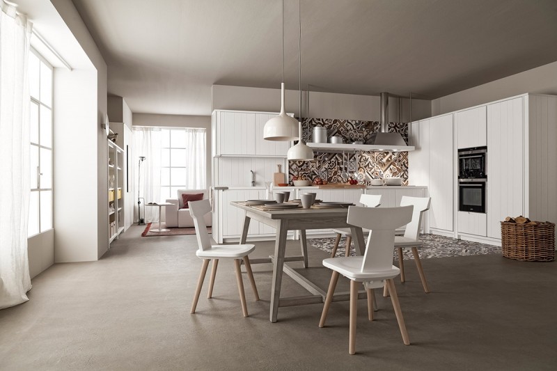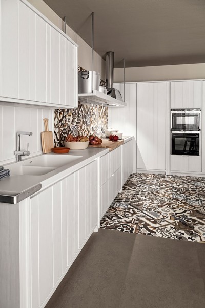 Il candore del bianco âtotal lookâ si anima da un rivestimento realizzato in piastrelle di ceramica a coprire pavimento e parete di fondo. Il ritmo dalle lavorazioni spezzano i blocchi che scendono fino a terra, interrompono la sequenza delle ante e donano carattere alla composizione.