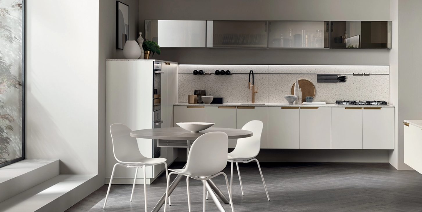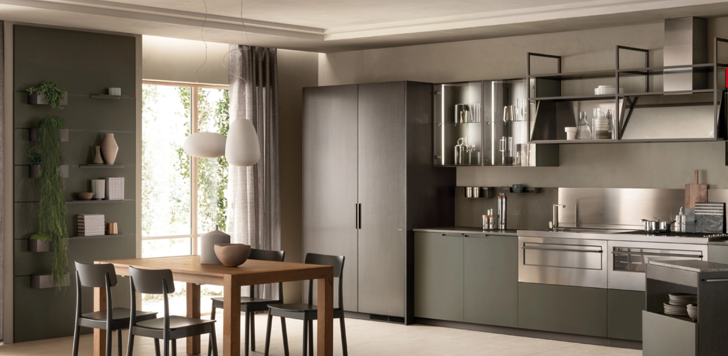 Molteplici, infatti, sono gli âingredientiâ a disposizione per costruirsi uno spazio-cucina su misura, âgustosoâ, confortevole, in cui mettersi in gioco tra i fornelli: maniglia dal disegno esclusivo, nuove finiture a disposizione (decorativo Rovere Gessato, Acciaio scuro, vetro Stopsol e Biomalta Argilla), un sorprendente Line System che permette funzionali e raffinate personalizzazioni.