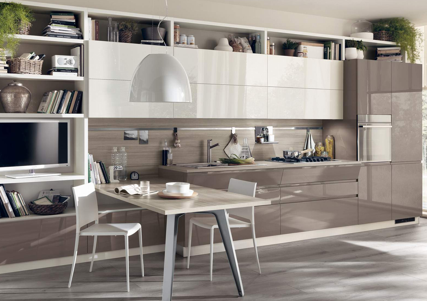Motus si distingue anche per una sofisticata gamma cromatica. La vasta linea di colori disponibili (tonalità di tendenza che vanno dal Bianco Prestige, al Grigio Ferro al Nero Ardesia) include anche la finitura laccata lucida Giallo Sole, scelta in questa composizione per caratterizzare la penisola e le schiene. Decorativo Olmo Navajo invece per le ante degli armadi e decorativo Bianco Puro per la soluzione a parete "Fluida".