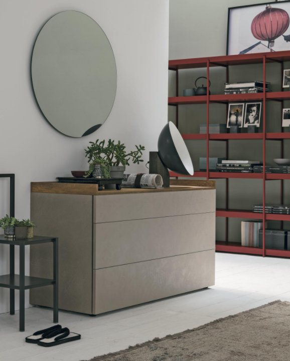 Finiture della foto / Comodini e comò Sir in materico cemento cava e top a vassoio materico nodato scuro.