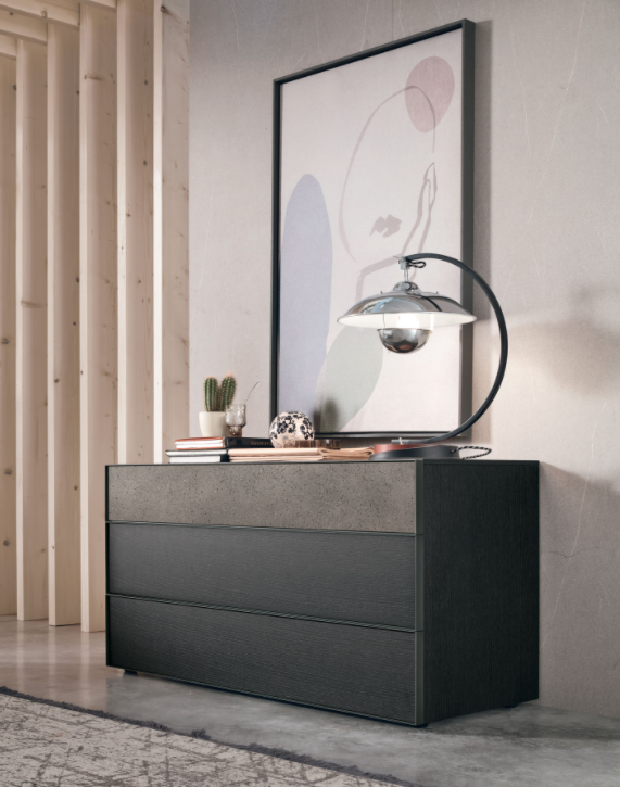 Finiture delle foto / Comodino e comò in materico rovere carbone, materico graniglia e profilo metallo antracite.