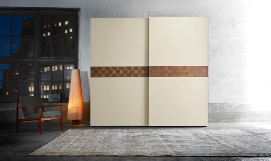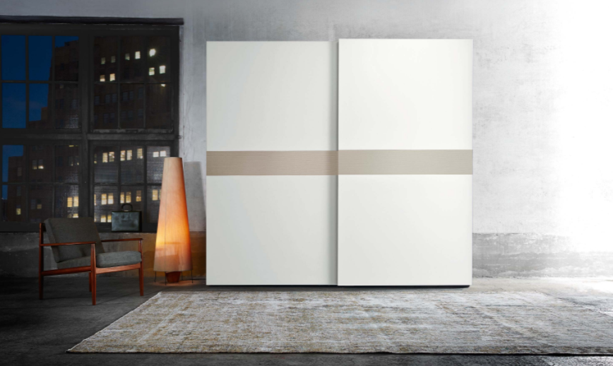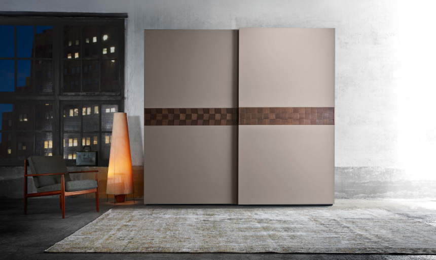 Linee decise per le ante scorrevoli con forte spessore di 50 mm, design sofisticato ed accogliente, concreto, amabile. Finiture della foto / Armadio anta Frame in legno poro aperto antracite 260, legno rovere termocotto.
