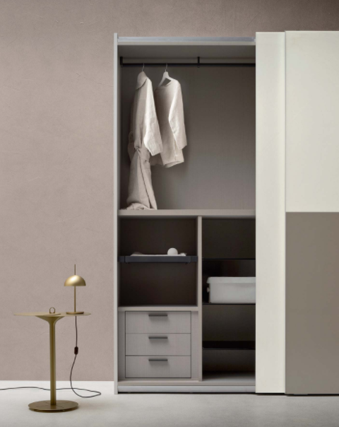 Forme geometriche e vetri colorati lucidi abbinati insieme, per dare vita ad un anta personalizzabile nella forma e nel colore. Finiture della foto / Armadio anta Kaori in materico opaco bianco gesso, vetro lucido bianco gesso 321 e hot 327.