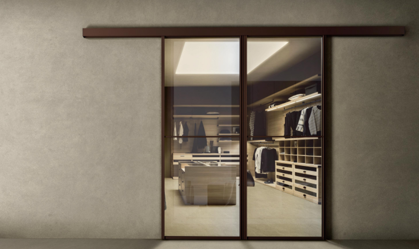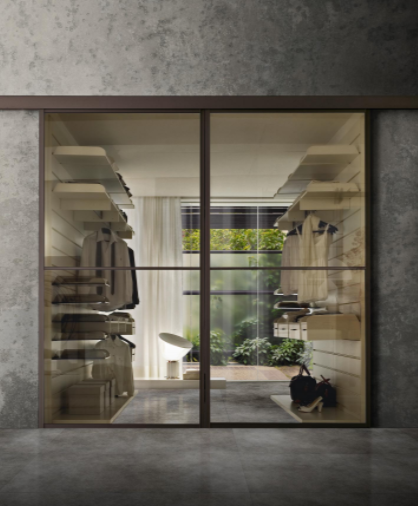 La qualità dei materiali utilizzati e la raffinatezza degli accostamenti fanno di âDoorsâ un sistema unico nel suo genere. Disponibile nelle finiture alluminio anodizzato argento o alluminio brown per il telaio e profili, con vetro bronzato (finitura bifacciale) o in tutti i vetri colorati.